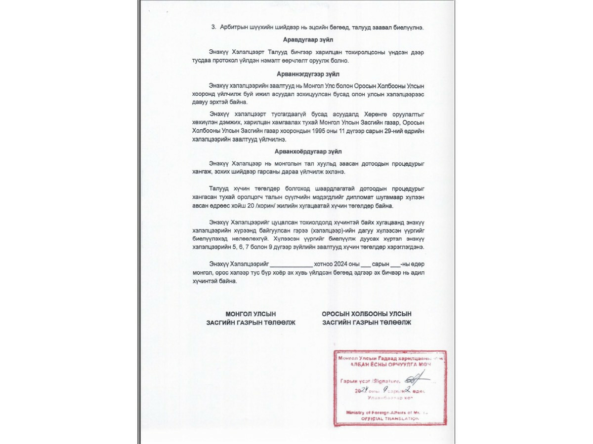 - Хэрэв маргаан эхэлсэн өдрөөс хойш 2 сарын дотор шийдвэрлэгдэхгүй тохиолдолд талуудын аль нэг талын хүсэлтээр ОХУ-ын Худалдаа, аж үйлдвэрийн танхим дахь Олон улсын арилжааны арбитрын шүүхэд түүний холбогдох дүрэм, журмын дагуу шилжүүлнэ