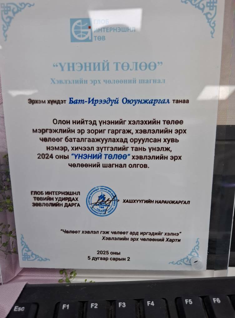 Глоб Интернэшнл Төв-өөс олгодог сэтгүүл зүйн нэр хүндтэй, үнэ цэнтэй “Үнэний төлөө” шагналын эзнээр “NTV” телевизийн сэтгүүлч Б.Оюунжаргал тодорлоо.