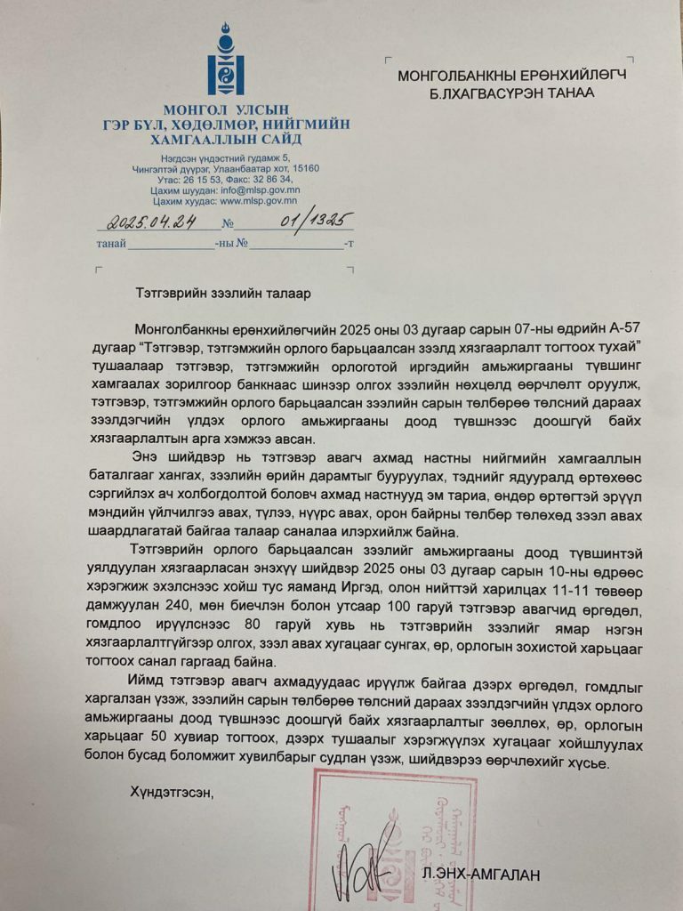 Тэгвэл түүний саналыг Монгол банк хүлээн авч хуучин горимд нь шилжүүлэхээр болжээ. Тодруулбал, Монголбанкнаас хоёрдугаар улиралд багтаан тэтгэврийн зээлийн шалгуурыг хуучин хэвэнд нь оруулна гэдгийг Монголбанкны дэд ерөнхийлөгч Г.Энхтайван мэдээлсэн байна.