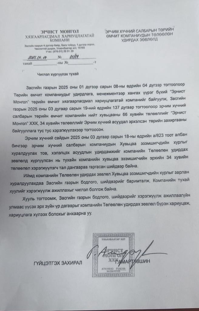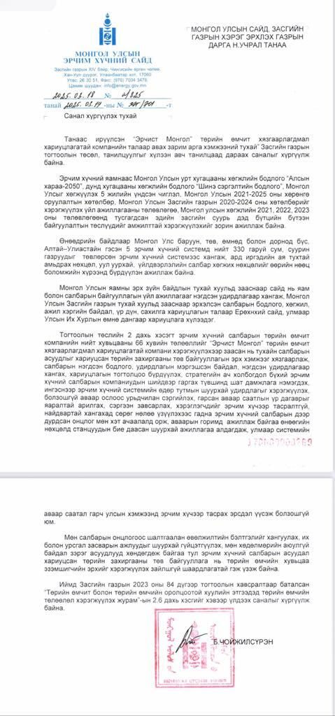 Хамгийн сүүлд Эрчим хүчний сайд Б.Чойжилсүрэнд хоёрдугаар сарын 8-нд албан бичгээр мэдэгджээ. Б.Чойжилсүрэн өөрөө шийдэх гэхээр “Эрчист Монгол” компани нь шийдэж өгдөггүй. Түүний дээр ЗГХЭГ бий. Дундаа шидсэн гарын үсэгнээс болж дохио өгч сануулсаар байсан турбин “амь тавьжээ”.