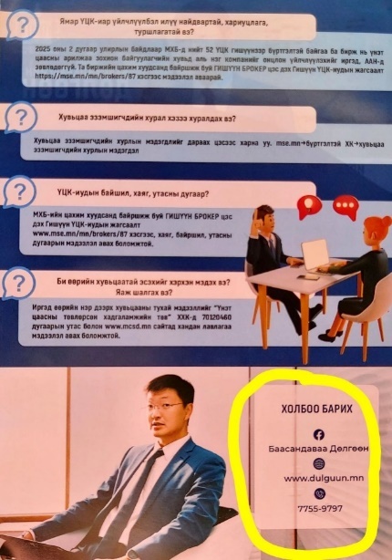 Түүнчлэн хамаарал бүхий этгээдүүдээ биржийн мөнгөөр цалинжуулах цар хүрээгээ улам тэлэхийг санаархаад зогсохгүй, зөвхөн өөрийн зураг, сошиал хаягууд, НИТХ-ын төлөөлөгчийн хувиар иргэдтэй холбогддог утасны дугаарыг байршуулсан сонгуулийн формат бүхий дараах олон мянган зурагт хуудсыг мөн Биржийн бизнес төлөвлөгөөнд тусган “Хөрөнгийн зах зээлийг олон нийтэд сурталчлах”-д төсөвлөсөн мөнгөнөөс хэвлүүлж тараагаад, үлдэгдлийг биржийн 1 давхарт эрээ цээргүй байршуулсныг ажлын шугамаар орж гарсан хөрөнгийн зах зээлийн мэргэжлийноролцогчид гайхаж, шүүмжлэн, элэглэх болжээ.