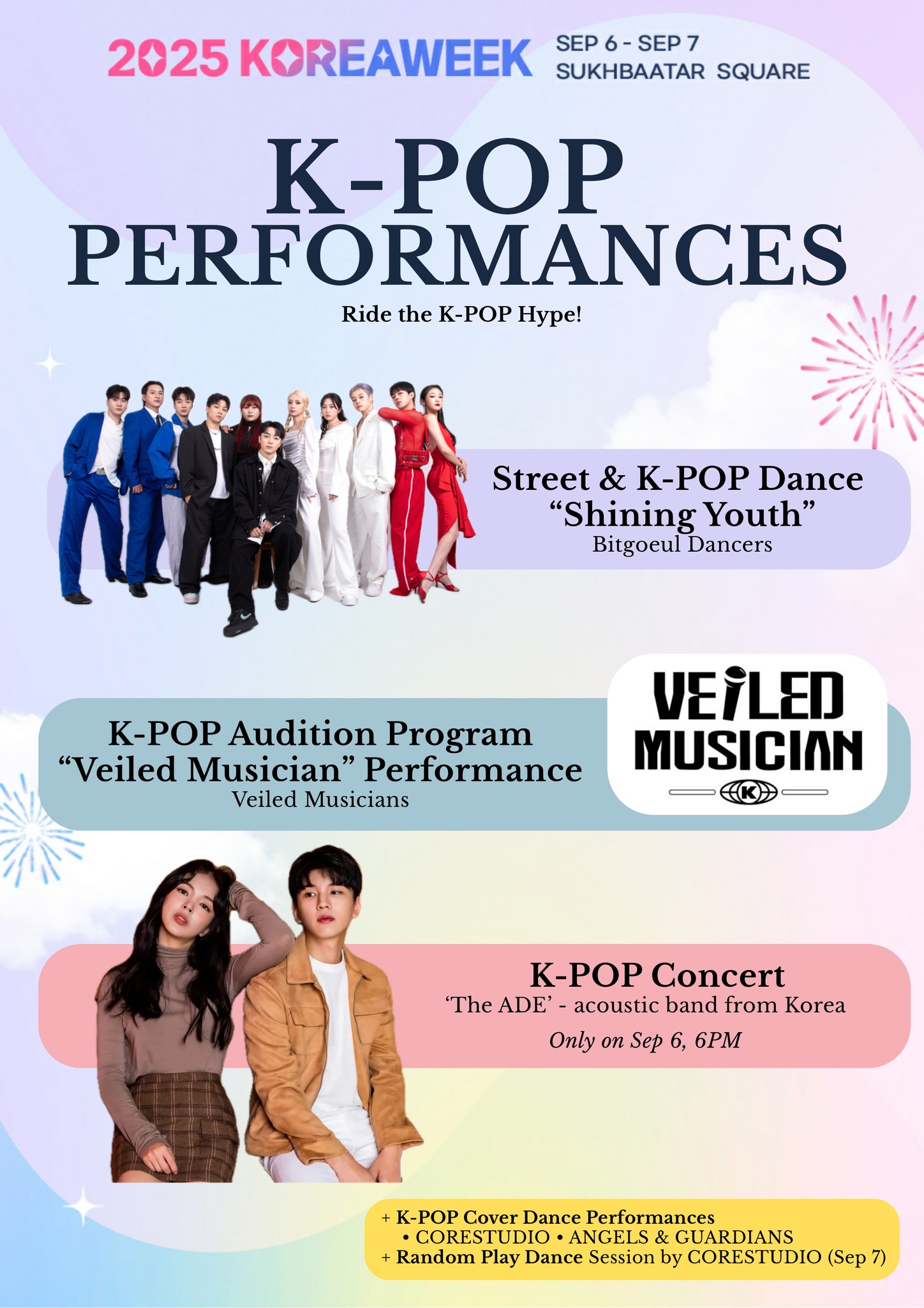 Мөн өдөр бүр K-POP дуучид тайзнаа гарч, Монгол фенүүддээ зориулан томоохон хэмжээний концерт толилуулахаар бэлдэж байгаа ба Монгол-Солонгосын соёлын солилцооны уур амьсгалыг улам тодотгон харуулах болно.