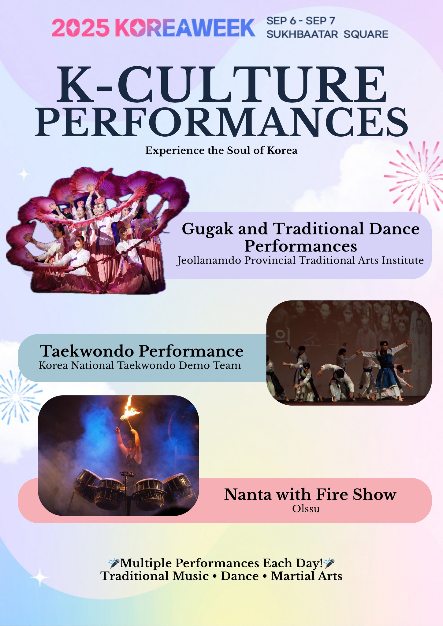 Монгол улс БНСУ -ын хооронд дипломат харилцаа тогтоосны 35 жилийн ой энэ жил тохиож байгаа бөгөөд “2025 Солонгосын соёлын өдрүүд” арга хэмжээний хүрээнд “үзүүлэх тоглолт”, “оролцоо” гэсэн хоёр гол сэдвийн дор хүрэлцэн ирж сонирхож буй иргэдэд таван мэдрэхгүйгээрээ мэдрэхүйц төрөл бүрийн сонирхолтой хөтөлбөрүүдийг толилуулахаар төлөвлөн ажиллаж байна.
