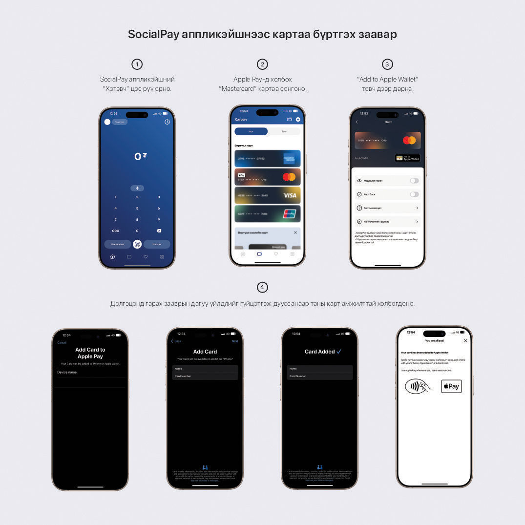 Та хараахан Голомт банкны харилцагч болж амжаагүй бол SocialPay аппликэйшнийг ашиглан зайнаас данс нээж, шинэ харилцагч болох боломжтой бөгөөд аппликэйшнээрээ Mastercard брэндийн Виртуал картыг идэвхжүүлж, картаа Apple Pay-д холбоорой. Үүний дараа Apple Pay-ээр хийсэн анхны гүйлгээндээ 40%-ийн буцаан олголт авах боломжтой.