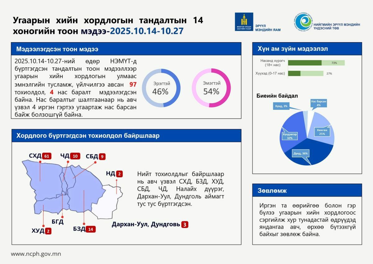 НЭМҮТ-д бүртгэгдсэн угаарын хийн хордлогын тандалтын тоон мэдээллээр 14 хоногийн дотор 4 иргэн угаартаж нас баржээ. Тодруулбал, энэ сарын 14-17-нд угаарын хийн хордлогын улмаас эмнэлгийн тусламж, үйлчилгээ авсан 97 тохиолдол бүртгэгдэж, 4 хүн нас барсан байна. Нас баралтыг шалтгаанаар нь авч үзвэл 4 иргэн гэртээ угаартаж нас барсан байж болзошгүй байна.