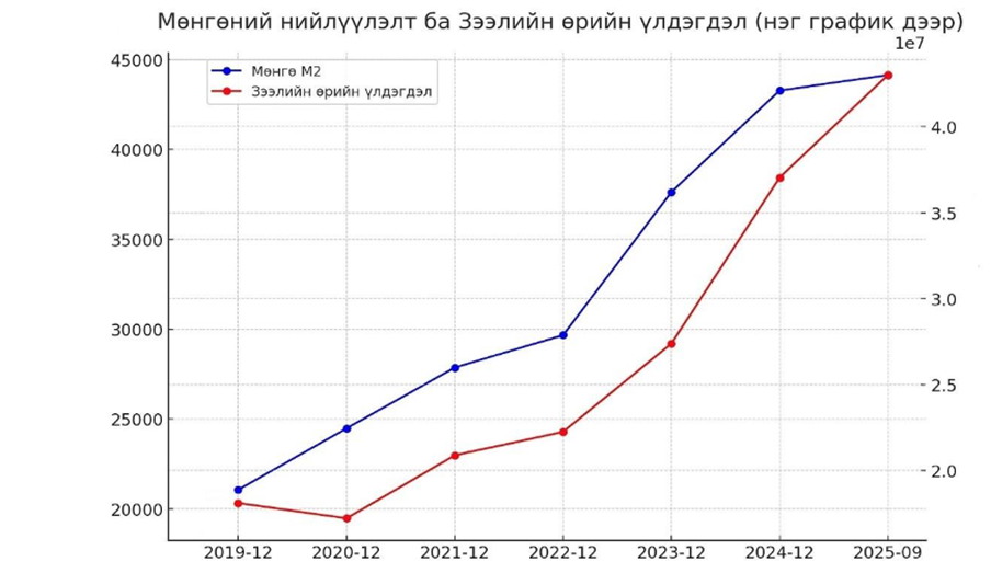 Өнгөрсөн 6 жилийн хугацаанд (2019 - 2025) мөнгөний нийлүүлэлт 21 ихнаяд төгрөгөөс 43 ихнаяд төгрөг болж 2 дахин өссөн байдаг (график харна уу). Үүнийгдагаад банкуудын зээлийн тэлэлт явагдаж арилжааны банкуудын зээл мөн 2 дахин өсөж 45 ихнаяд төгрөг хүрсэн. Статистик мэдээгээр эдийн засгийн өсөлт жил бүр дунджаар 5-7% өсөлттэй байсан бол мөнгөний тоо хэмжээ жилд дунджаар 15-20% өсөж байжээ. Нэг үгээр зах зээлд үйлдвэрлэж нийлүүлсэн хэрэглээний барааны тоо хэмжээнээс мөнгөний тоо хэмжээ нь 3-4 дахин илүү их өсөж байсан байна. Төрөөс зээл, халамжаар зах зээлд цутгасан илүү мөнгө нь үйлдвэрлэсэн цөөн тооны барааг хэрэглэгчдийн уралдаж худалдан авах өрсөлдөөн хүчтэй өрнүүлж зохиомол агрегатан эрэлтийг үүсгэсэн гэсэн үг. Тиймээс Монголын инфляц нь ямагт эрэлтийн инфляц байдаг.