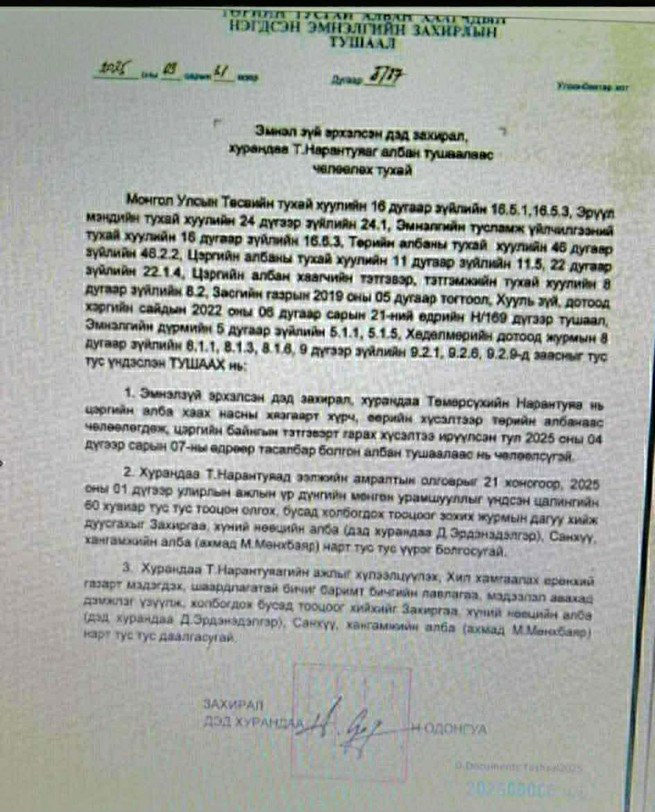 Төрийн тусгай албан хаагчдын нэгдсэн эмнэлгээс цэргийн албаны хугацаагаа гүйцээж тэтгэмжээ авсан бэлтгэл хурандаа Т.Нарантуяа нь ХЗДХЯ-ны сайдын тушаалаар тус эмнэлэгийн захирлын албан үүргийг түр орлон гүйцэтгэгчээр томилогдоод 1 сарын хугацаанд ажиллахдаа өмнөх захирлын томилсон гэх тодотголтой үйлчлэгч, эмч, алба хэлтсийн дарга, шилжин ирсэн цэргийн албан хаагч зэрэг 30 орчим албан хаагчдыг бүтэц өөрчлөгдсөн гэх шалтгаанаар хомроглон халж, улмаар дарамтлан тушаал бууруулах зэргээр дураараа авирлан бурхангүй газрын буг галзуурна гэгч болж байна.