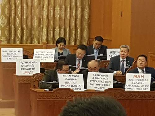 УИХ-ын чуулганы өнөөдрийн (2019.05.30) нэгдсэн хуралдааны үеэр Ардчилсан намын зөвлөлийн гишүүд эсэргүүцэл илэрхийллээ.